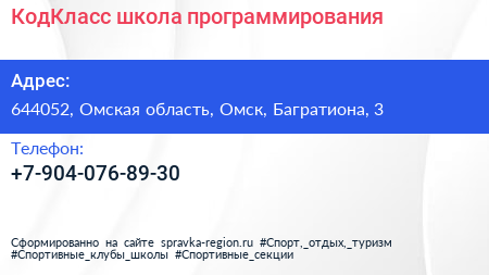 КодКласс, школа программирования по адресу 644052, Омская область, Омск, Багратиона, 3 в дальнейшем Организация, размещена в следующих категориях: