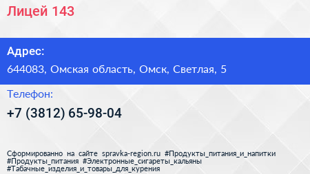 Лицей №143 по адресу 644083, Омская область, Омск, Светлая, 5 в дальнейшем Организация, размещена в следующих категориях: