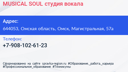 MUSICAL SOUL, студия вокала по адресу 644053, Омская область, Омск, Магистральная, 57а в дальнейшем Организация, размещена в следующих категориях: