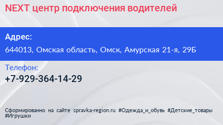 NEXT, центр подключения водителей по адресу 644013, Омская область, Омск, Амурская 21-я, 29Б в дальнейшем Организация, размещена в следующих категориях: