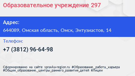 Образовательное учреждение №297 по адресу 644089, Омская область, Омск, Энтузиастов, 14 в дальнейшем Организация, размещена в следующих категориях: