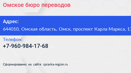 Омское бюро переводов по адресу 644010, Омская область, Омск, проспект Карла Маркса, 17 в дальнейшем Организация, размещена в следующих категориях: