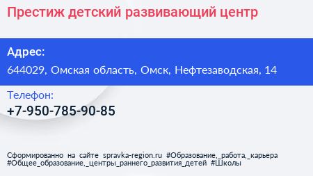 Престиж, детский развивающий центр по адресу 644029, Омская область, Омск, Нефтезаводская, 14 в дальнейшем Организация, размещена в следующих категориях: