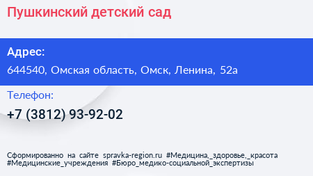 Пушкинский детский сад по адресу 644540, Омская область, Омск, Ленина, 52а в дальнейшем Организация, размещена в следующих категориях: