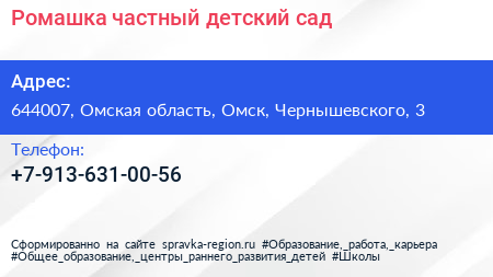 Ромашка, частный детский сад по адресу 644007, Омская область, Омск, Чернышевского, 3 в дальнейшем Организация, размещена в следующих категориях: