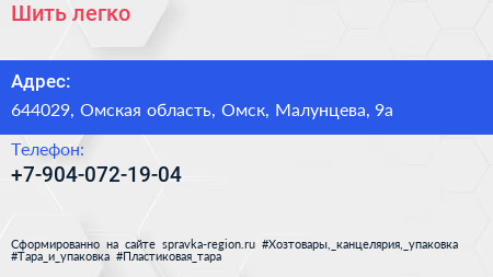 Шить легко по адресу 644029, Омская область, Омск, Малунцева, 9а в дальнейшем Организация, размещена в следующих категориях:
