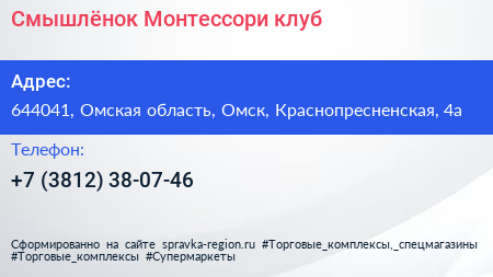 Смышлёнок, Монтессори-клуб по адресу 644041, Омская область, Омск, Краснопресненская, 4а в дальнейшем Организация, размещена в следующих категориях: