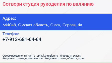 Сотвори, студия рукоделия по валянию по адресу 644048, Омская область, Омск, Серова, 4а в дальнейшем Организация, размещена в следующих категориях: