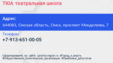 ТЮА, театральная школа по адресу 644083, Омская область, Омск, проспект Менделеева, 7 в дальнейшем Организация, размещена в следующих категориях: