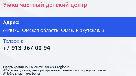 Умка, частный детский центр по адресу 644070, Омская область, Омск, Иркутская, 3 в дальнейшем Организация, размещена в следующих категориях: