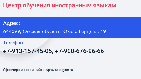 Центр обучения иностранным языкам по адресу 644099, Омская область, Омск, Герцена, 19 в дальнейшем Организация, размещена в следующих категориях: