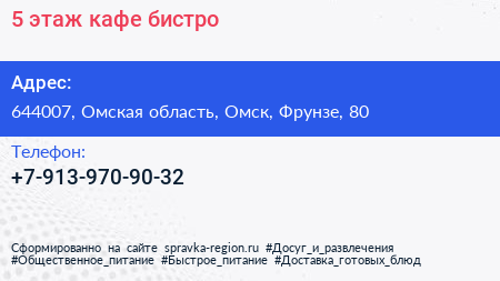 5 этаж, кафе-бистро по адресу 644007, Омская область, Омск, Фрунзе, 80 в дальнейшем Организация, размещена в следующих категориях: