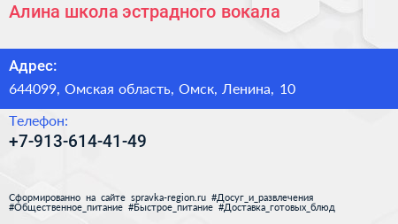 Алина, школа эстрадного вокала по адресу 644099, Омская область, Омск, Ленина, 10 в дальнейшем Организация, размещена в следующих категориях: