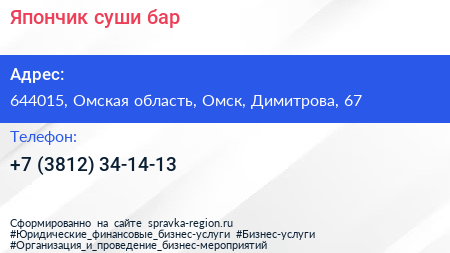Япончик, суши-бар по адресу 644015, Омская область, Омск, Димитрова, 67 в дальнейшем Организация, размещена в следующих категориях: