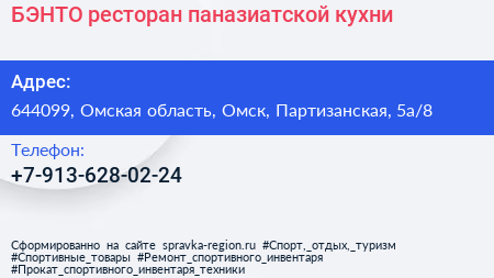 БЭНТО, ресторан паназиатской кухни по адресу 644099, Омская область, Омск, Партизанская, 5а/8 в дальнейшем Организация, размещена в следующих категориях: