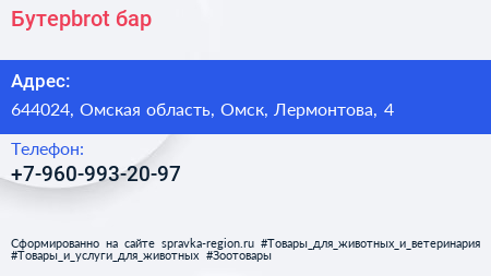Бутерbrot, бар по адресу 644024, Омская область, Омск, Лермонтова, 4 в дальнейшем Организация, размещена в следующих категориях: