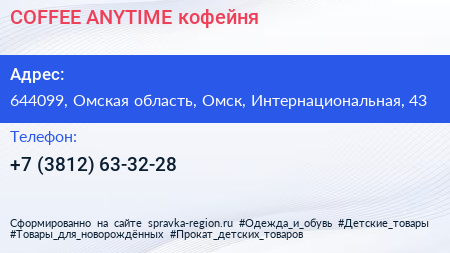 COFFEE ANYTIME, кофейня по адресу 644099, Омская область, Омск, Интернациональная, 43 в дальнейшем Организация, размещена в следующих категориях: