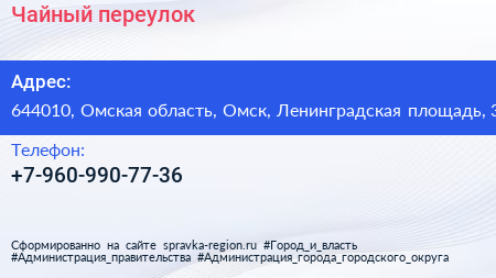 Чайный переулок по адресу 644010, Омская область, Омск, Ленинградская площадь, 3 в дальнейшем Организация, размещена в следующих категориях: