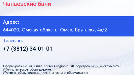 Чапаевские бани по адресу 644020, Омская область, Омск, Братская, 4а/2 в дальнейшем Организация, размещена в следующих категориях: