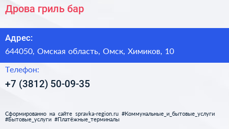 Дрова, гриль-бар по адресу 644050, Омская область, Омск, Химиков, 10 в дальнейшем Организация, размещена в следующих категориях: