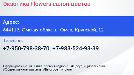 Экзотика Flowers, салон цветов по адресу 644119, Омская область, Омск, Крупской, 12 в дальнейшем Организация, размещена в следующих категориях: