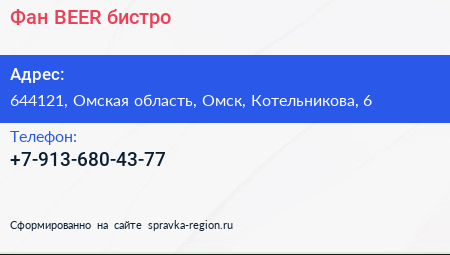 Фан-BEER, бистро по адресу 644121, Омская область, Омск, Котельникова, 6 в дальнейшем Организация, размещена в следующих категориях: