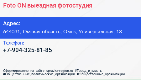 Foto-ON, выездная фотостудия по адресу 644031, Омская область, Омск, Универсальная, 13 в дальнейшем Организация, размещена в следующих категориях: