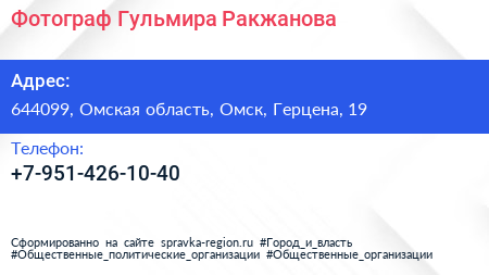Фотограф Гульмира Ракжанова по адресу 644099, Омская область, Омск, Герцена, 19 в дальнейшем Организация, размещена в следующих категориях: