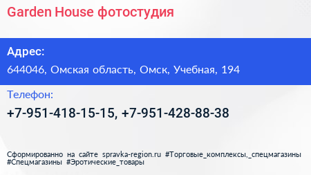 Garden House, фотостудия по адресу 644046, Омская область, Омск, Учебная, 194 в дальнейшем Организация, размещена в следующих категориях: