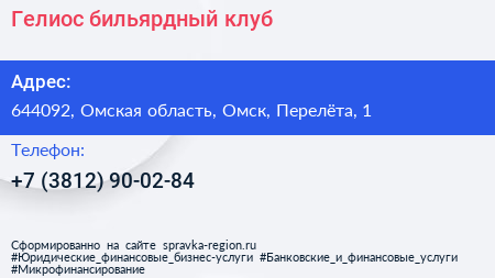 Гелиос, бильярдный клуб по адресу 644092, Омская область, Омск, Перелёта, 1 в дальнейшем Организация, размещена в следующих категориях: