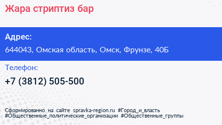 Жара, стриптиз-бар по адресу 644043, Омская область, Омск, Фрунзе, 40Б в дальнейшем Организация, размещена в следующих категориях: