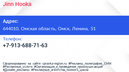 Jinn Hooka по адресу 644010, Омская область, Омск, Ленина, 51 в дальнейшем Организация, размещена в следующих категориях: