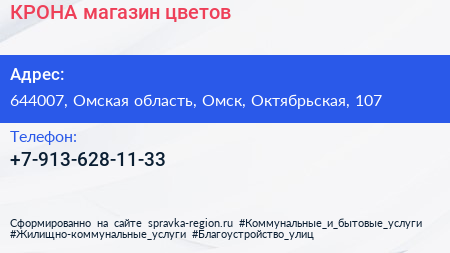 КРОНА, магазин цветов по адресу 644007, Омская область, Омск, Октябрьская, 107 в дальнейшем Организация, размещена в следующих категориях:
