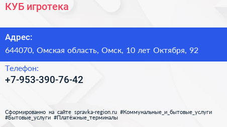 КУБ, игротека по адресу 644070, Омская область, Омск, 10 лет Октября, 92 в дальнейшем Организация, размещена в следующих категориях: