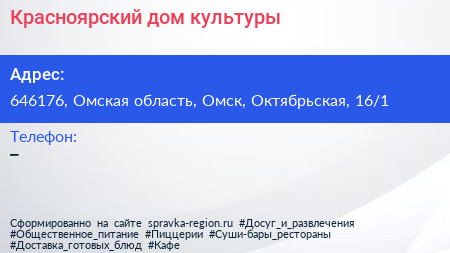 Красноярский дом культуры по адресу 646176, Омская область, Омск, Октябрьская, 16/1 в дальнейшем Организация, размещена в следующих категориях: