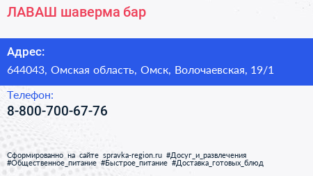 #ЛАВАШ, шаверма-бар по адресу 644043, Омская область, Омск, Волочаевская, 19/1 в дальнейшем Организация, размещена в следующих категориях: