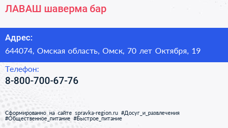 #ЛАВАШ, шаверма-бар по адресу 644074, Омская область, Омск, 70 лет Октября, 19 в дальнейшем Организация, размещена в следующих категориях:
