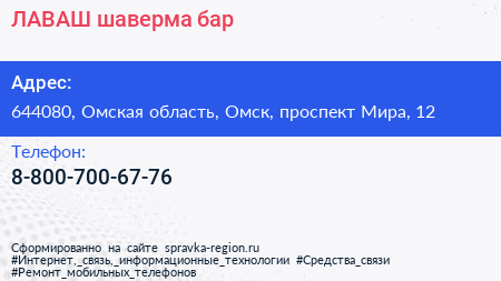 #ЛАВАШ, шаверма-бар по адресу 644080, Омская область, Омск, проспект Мира, 12 в дальнейшем Организация, размещена в следующих категориях: