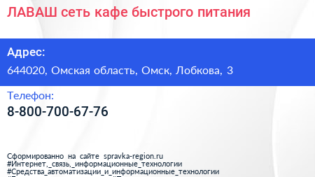 #ЛАВАШ, сеть кафе быстрого питания по адресу 644020, Омская область, Омск, Лобкова, 3 в дальнейшем Организация, размещена в следующих категориях: