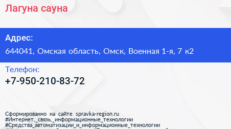 Лагуна, сауна по адресу 644041, Омская область, Омск, Военная 1-я, 7 к2 в дальнейшем Организация, размещена в следующих категориях: