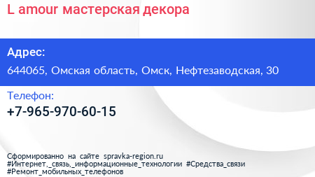 L`amour, мастерская декора по адресу 644065, Омская область, Омск, Нефтезаводская, 30 в дальнейшем Организация, размещена в следующих категориях: