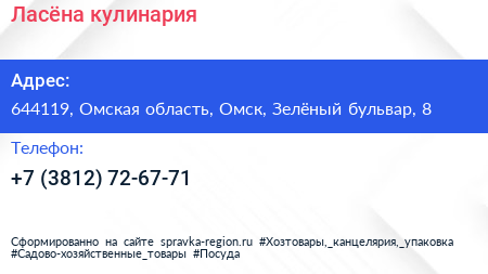 Ласёна, кулинария по адресу 644119, Омская область, Омск, Зелёный бульвар, 8 в дальнейшем Организация, размещена в следующих категориях: