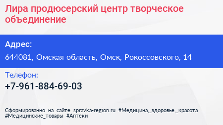 Лира, продюсерский центр творческое объединение по адресу 644081, Омская область, Омск, Рокоссовского, 14 в дальнейшем Организация, размещена в следующих категориях:
