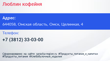 Люблин, кофейня по адресу 644058, Омская область, Омск, Целинная, 4 в дальнейшем Организация, размещена в следующих категориях: