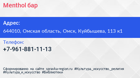 Menthol, бар по адресу 644010, Омская область, Омск, Куйбышева, 113 к1 в дальнейшем Организация, размещена в следующих категориях: