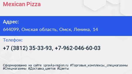 Mexican Pizza по адресу 644099, Омская область, Омск, Ленина, 14 в дальнейшем Организация, размещена в следующих категориях: