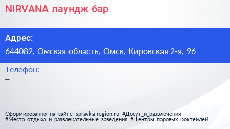 NIRVANA, лаундж-бар по адресу 644082, Омская область, Омск, Кировская 2-я, 96 в дальнейшем Организация, размещена в следующих категориях: