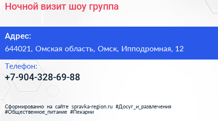 Ночной визит, шоу-группа по адресу 644021, Омская область, Омск, Ипподромная, 12 в дальнейшем Организация, размещена в следующих категориях: