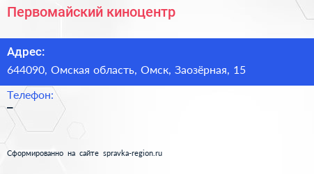 Первомайский, киноцентр по адресу 644090, Омская область, Омск, Заозёрная, 15 в дальнейшем Организация, размещена в следующих категориях: