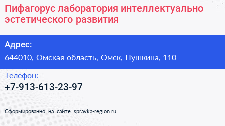 Пифагорус, лаборатория интеллектуально-эстетического развития по адресу 644010, Омская область, Омск, Пушкина, 110 в дальнейшем Организация, размещена в следующих категориях: